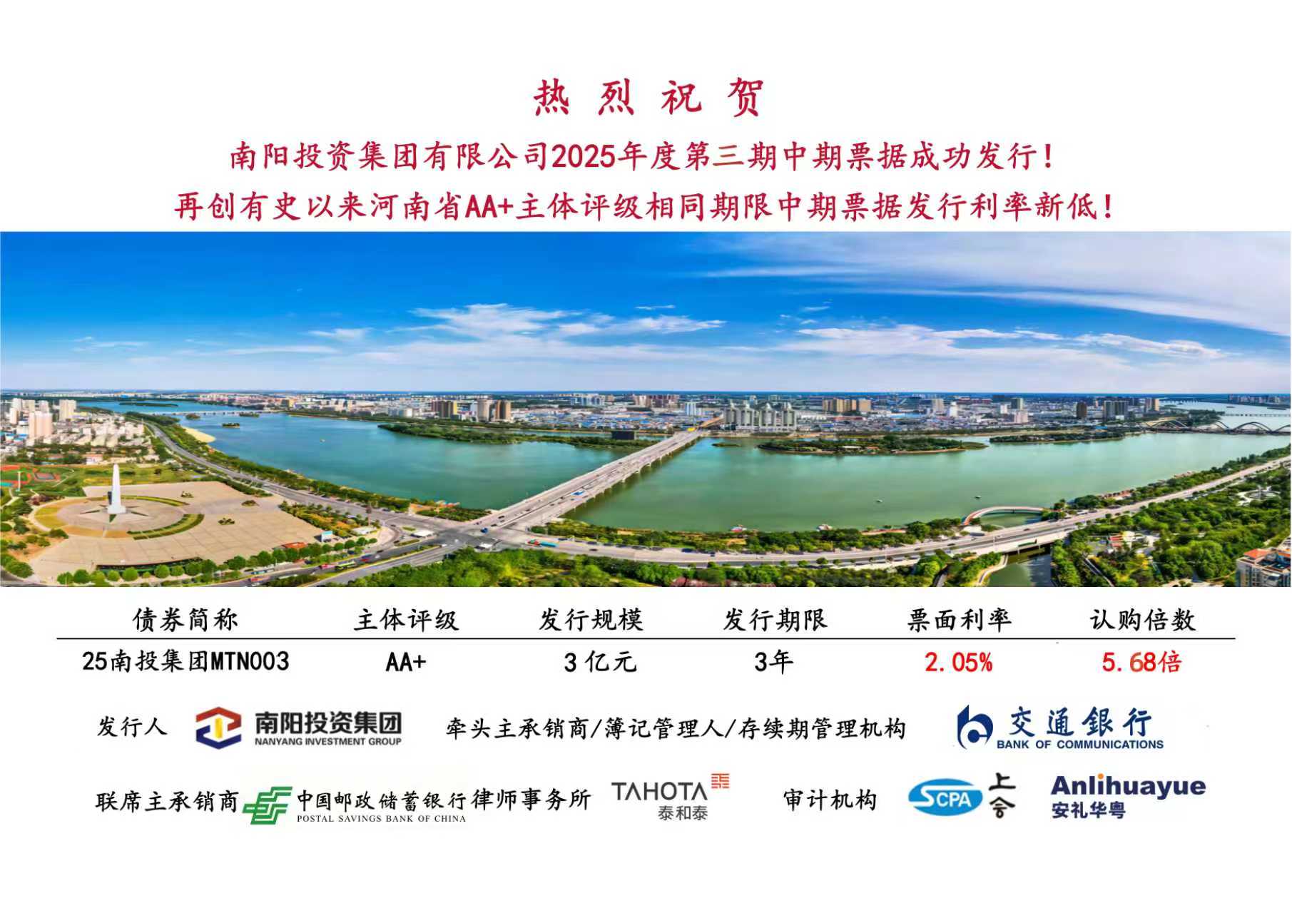 近日,南阳投资集团2025年度第二、三期中期票据在银行间市场成功发行。债券规模分别为3.6亿元、3亿元,发行期限3年,票面利率分别为2.08%、2.05%,创有史以来河南省AA+主体评级相同期限中期票据发行利率新低!