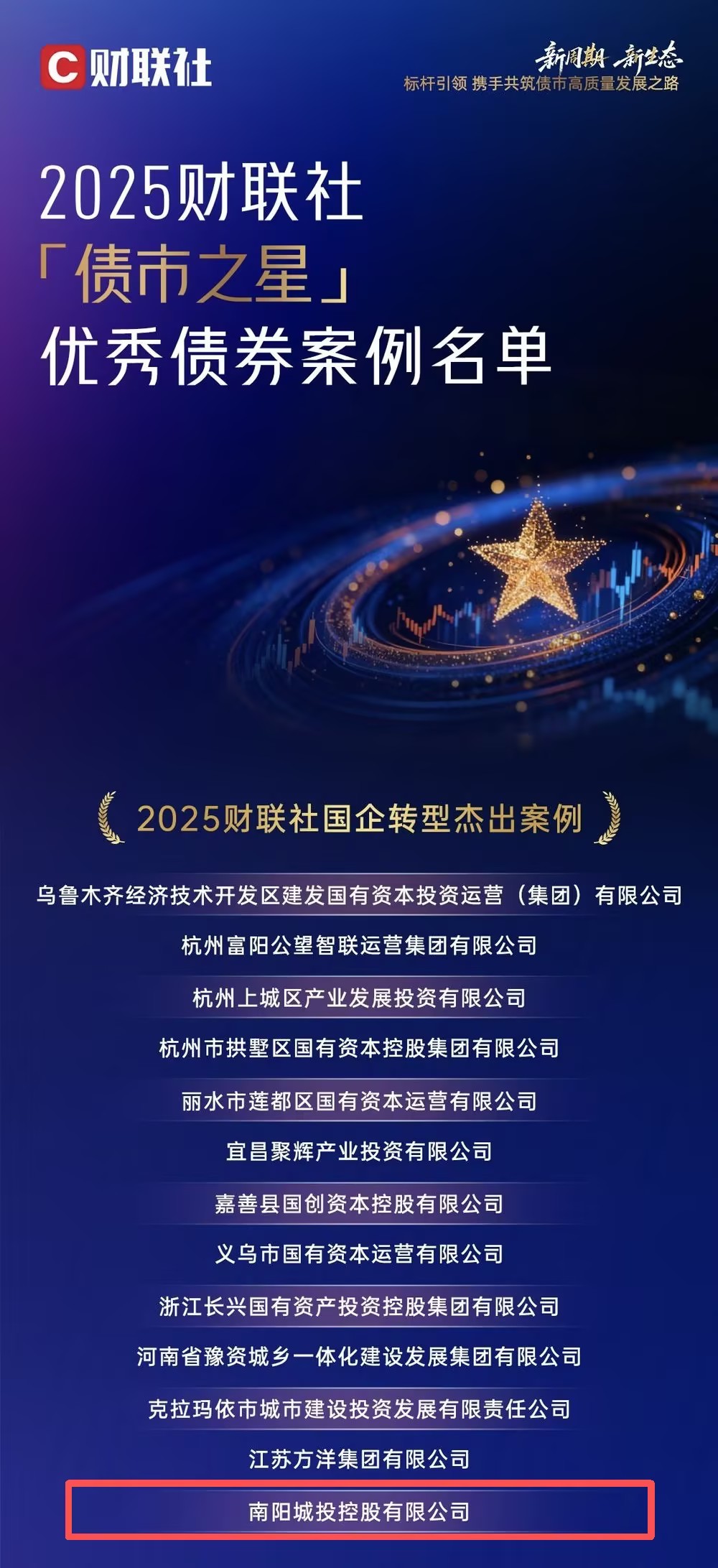近日,资本市场传来捷报!在2025财联社“债市之星”优秀债券案例评选中,南阳投资集团旗下核心子公司—南阳城投控股有限公司(以下简称“城投控股公司”)凭借其市场化转型与融资创新实践,从全国百余家金融机构、近200份案例中脱颖而出,荣获“国企转型杰出案例”奖,成为河南省在此次评选中唯一获奖的市级主体。